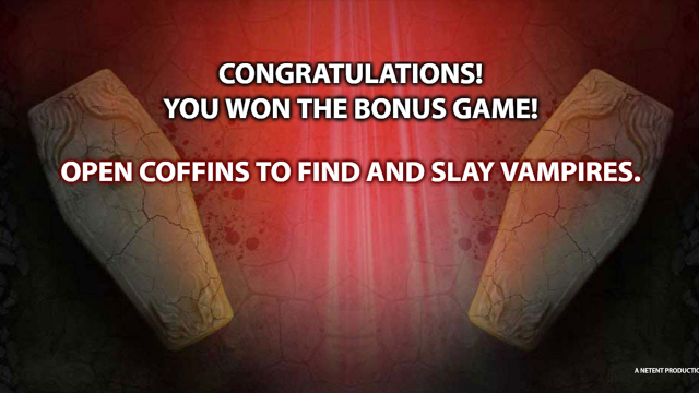 Бонусный раунд активируется при выпадении 3 иконок с изображением дубинки и молота. Призовая игра проводится в отдельном окне. Здесь предложено 12 гробов. В них отдыхают кровопийцы. Задача — открывать гробы, вбивать осиновый кол в сердце вурдалаков. За выполнение действий начисляются награды. Они суммируются и переводятся на счет по окончании раунда. Бонусный тур завершается без наград, если открытый гроб окажется пустым.